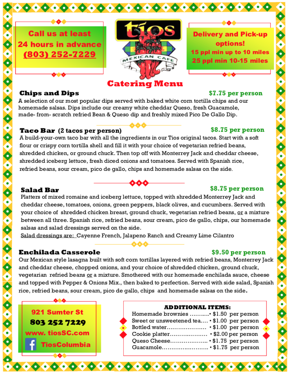 Tios Mexican Cafe 921 Sumter St Columbia Sc Us 29201 Tel 803 252 7229 Restaurant Hours Monday Thru Wednesday 11 00am 11 00pm Thursday Thru Saturday 11 00am 11 30pm Facebook Twitter Instagram Home Order Online Find Us Order